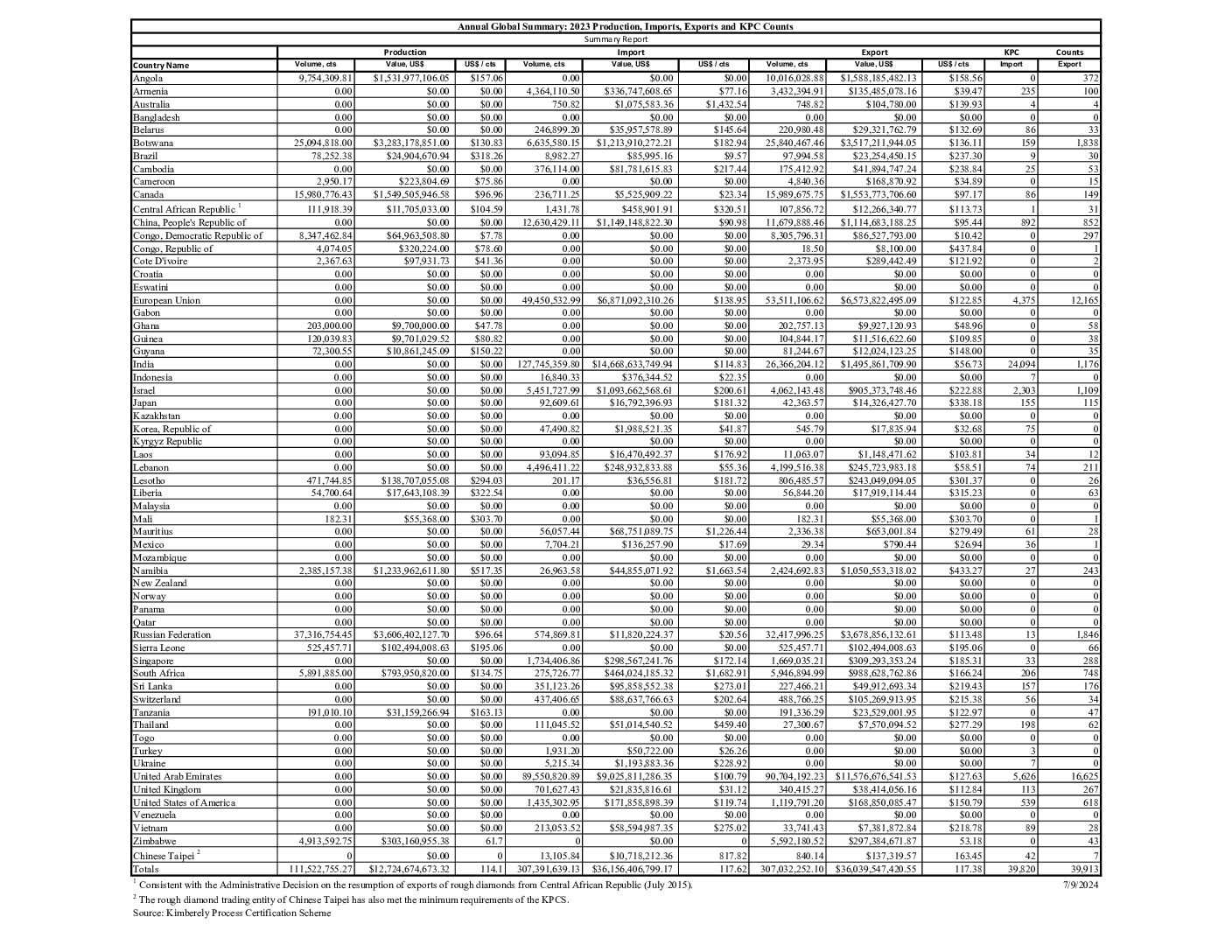 Kimberley Statistics Global Summary 2023